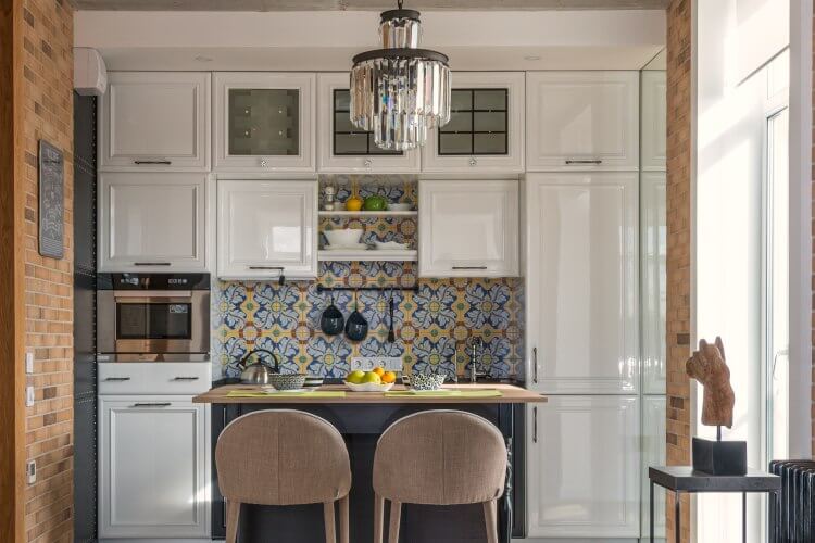 Small kitchen with colourful splashback and statement pendant lightSmall kitchen with colourful splashback and statement pendant light