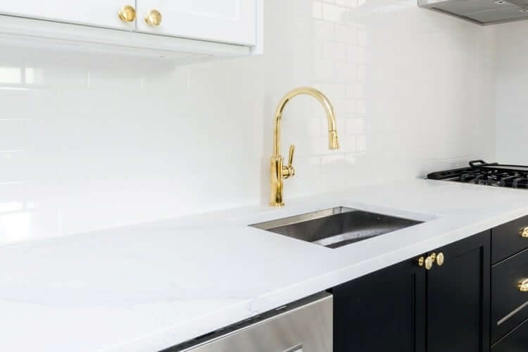 Stylish black and white kitchen with gold hardware